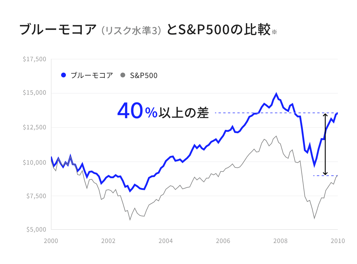 ドットコムバブルの弾けた2000年から10年間のような市場停滞期の場合、S&P500よりもブルーモコアのようなバランス型運用のパフォーマンスが高くなります。