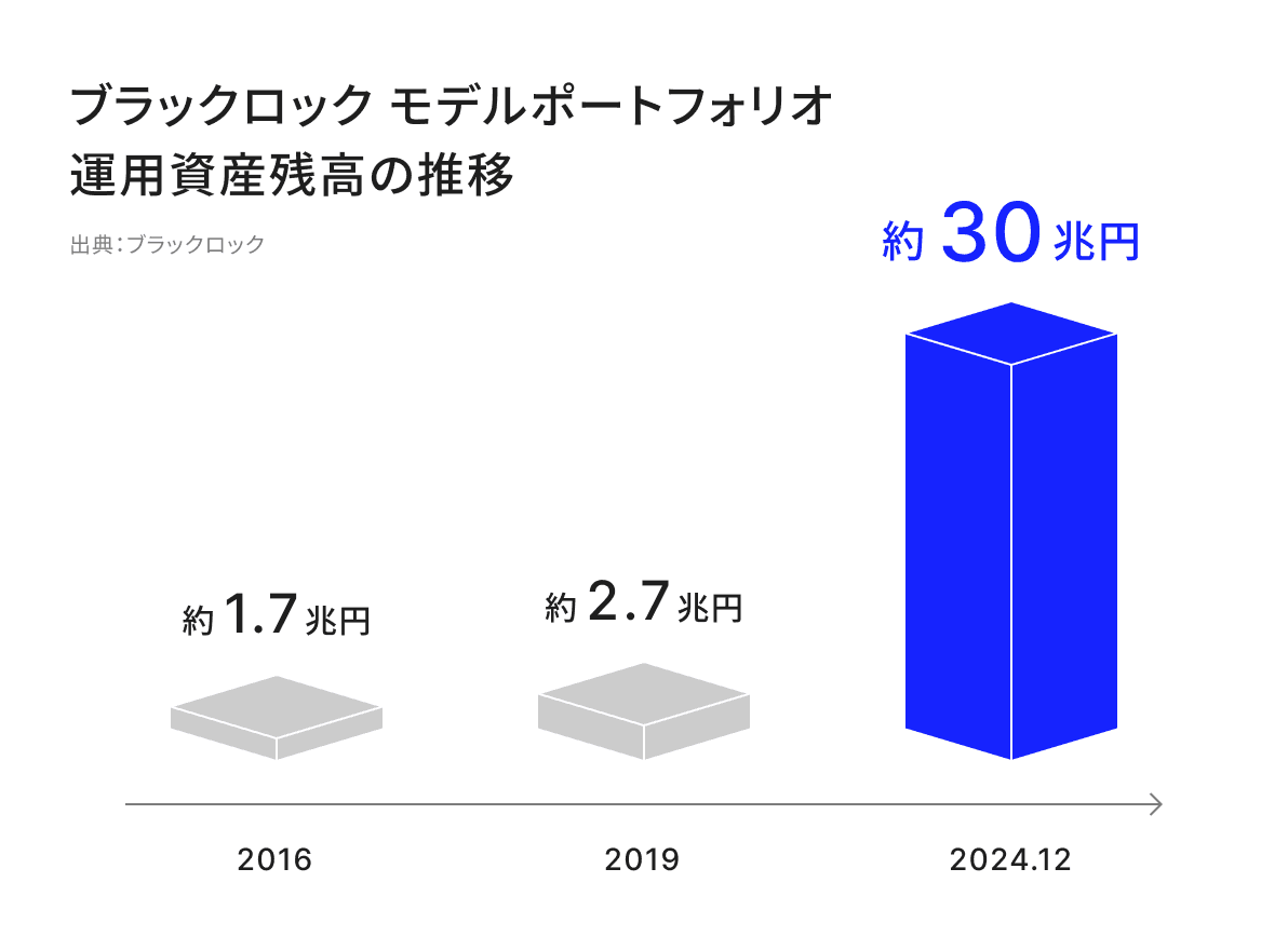 ブラックロックがグローバルに展開する、モデルポートフォリオを活用した運用は、2024年末時点で約30兆円の実績があり、主に米国の富裕層・準富裕層の運用に活用されています。