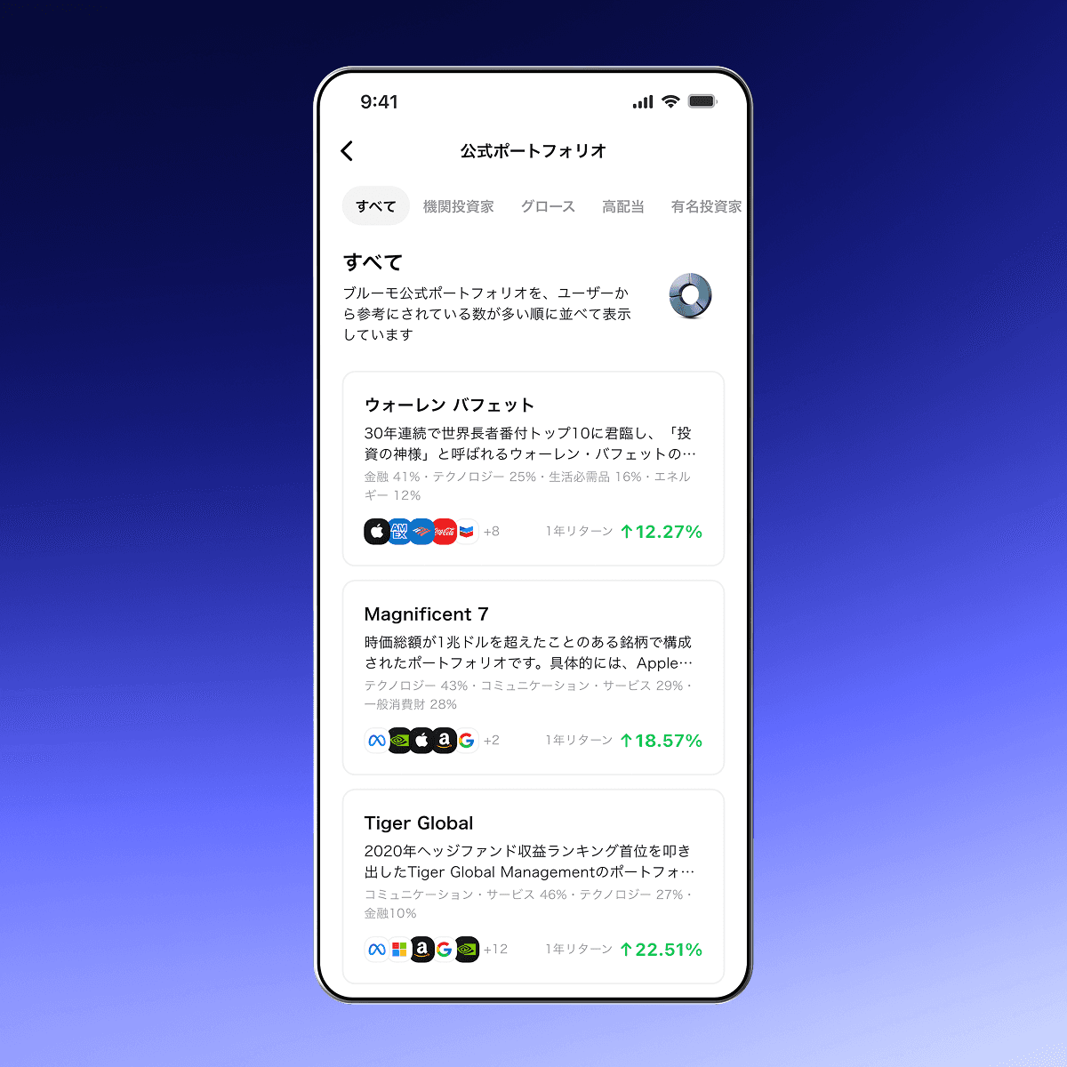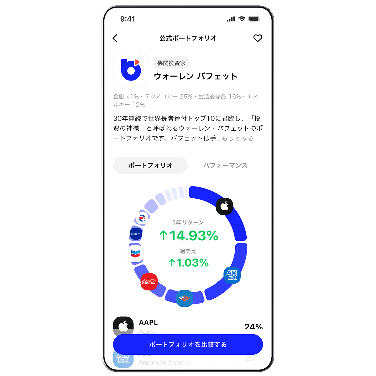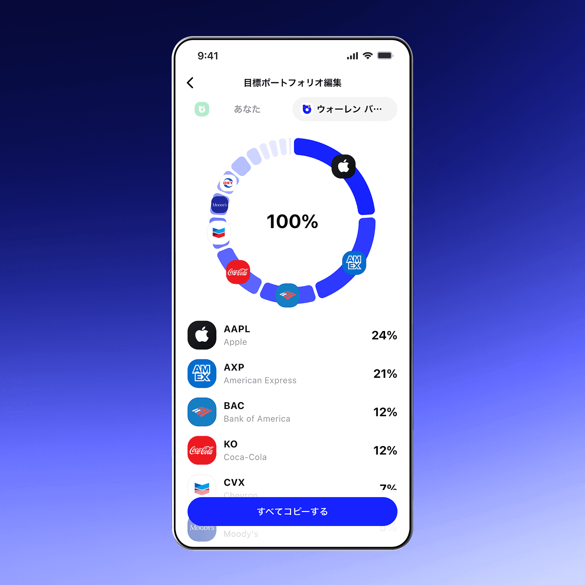 ウォーレン・バフェットのような著名投資家のポートフォリオをコピーしてそのまま投資できます。