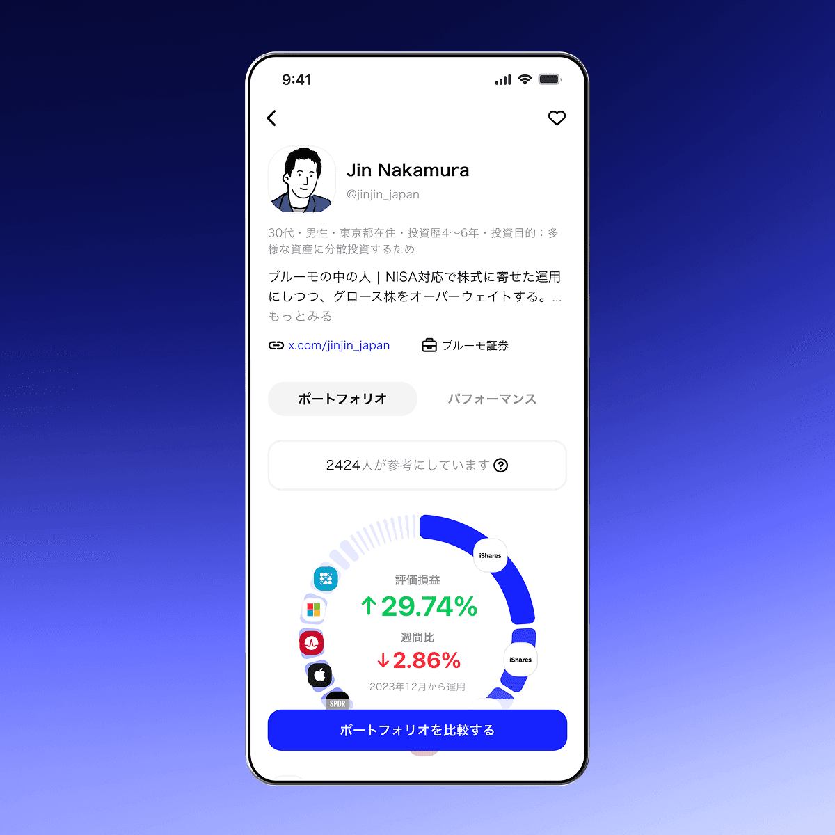 他のユーザーのポートフォリオを見て参考にしたり、コピーして投資を始められます。