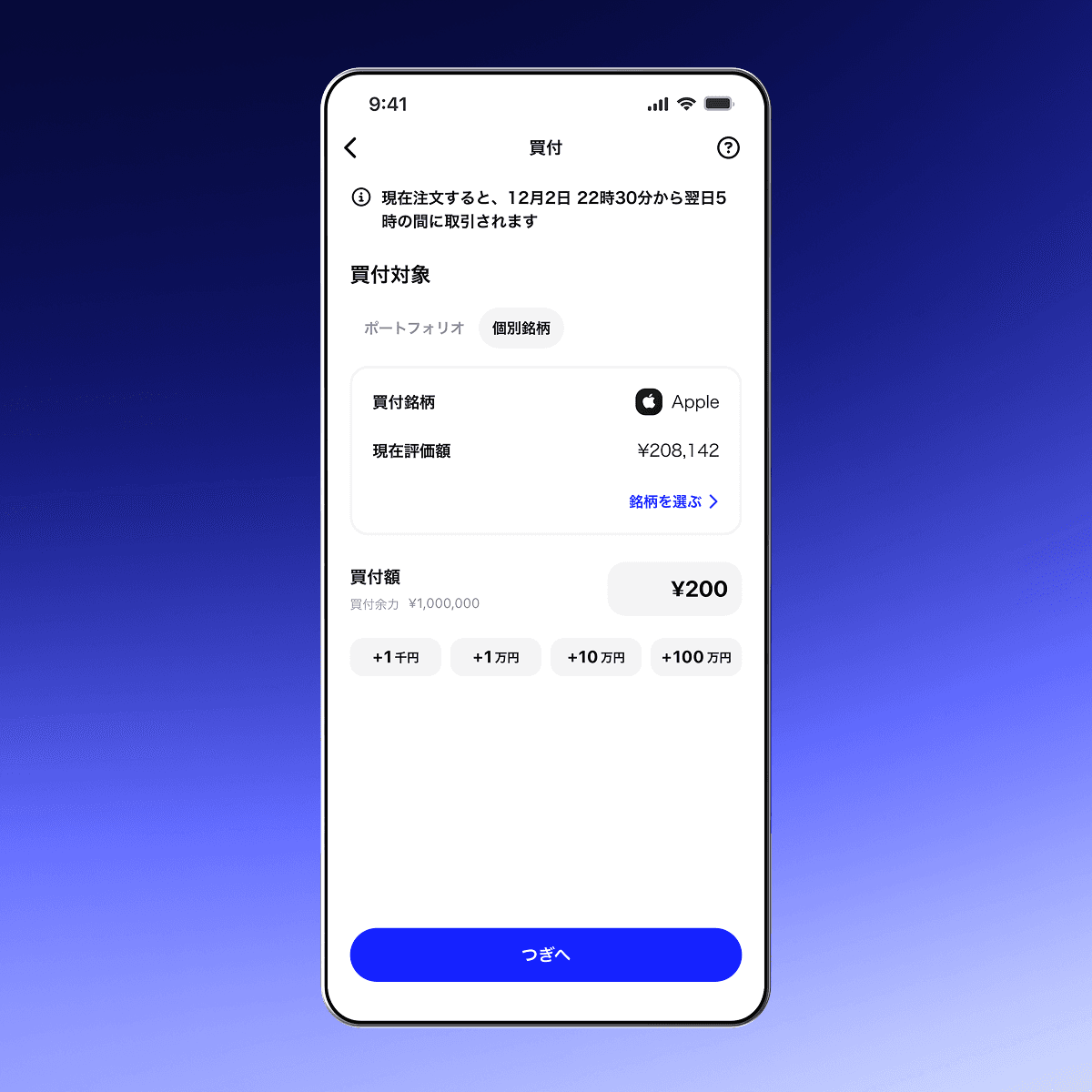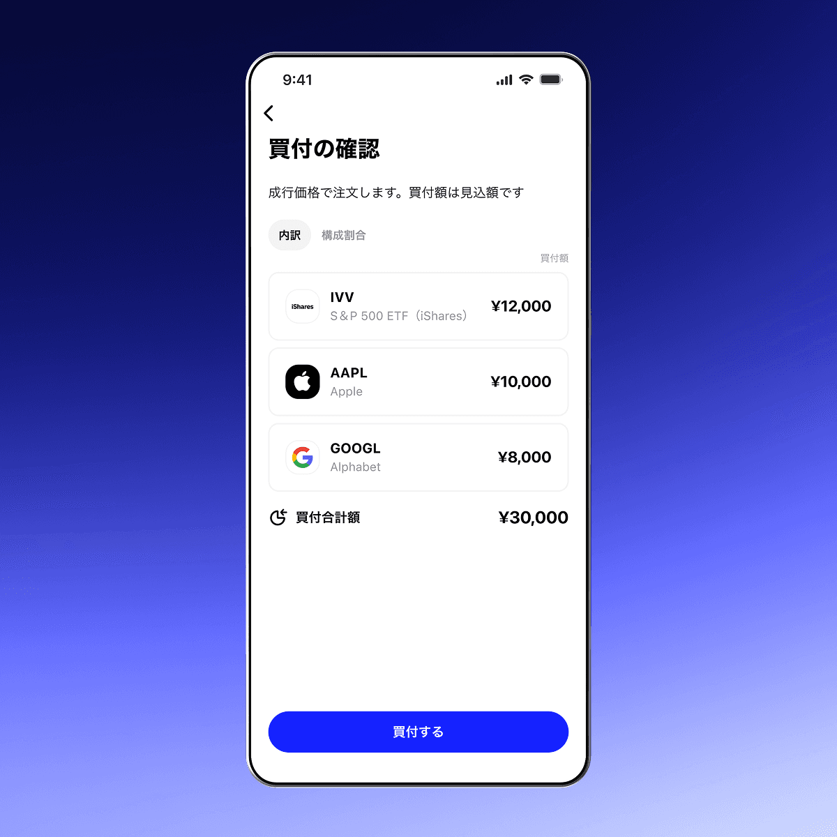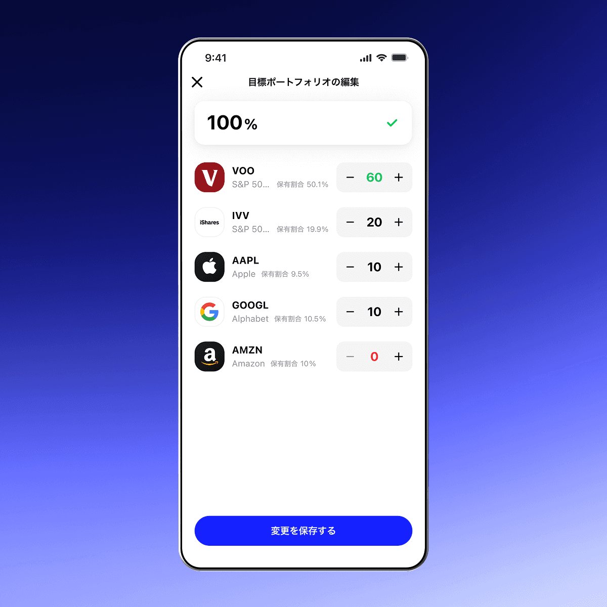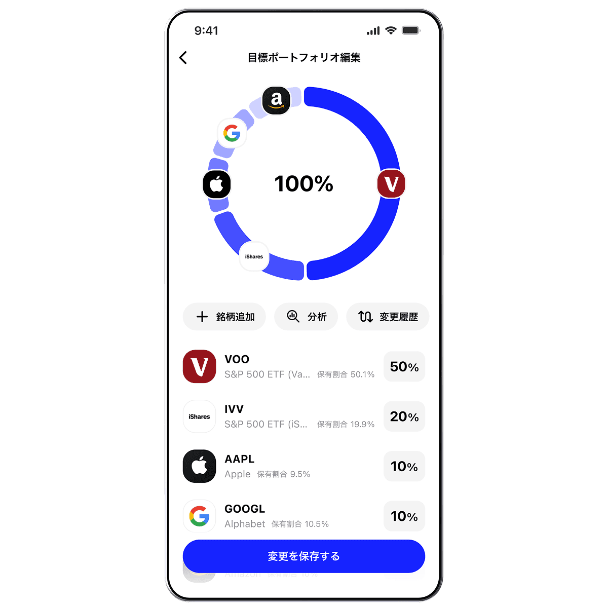 投資したい銘柄と割合を示した、目標ポートフォリオを設定してアプリで注文するだけで両替・取引はブルーモが実行してくれます。